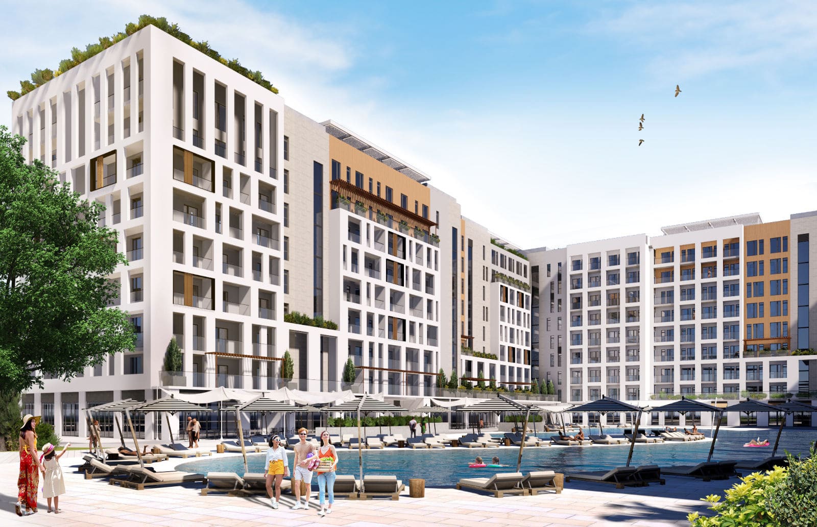 Современная архитектурная концепция с использованием премиальных материалов. Каждая деталь продумана для создания атмосферы курортного уюта и городского комфорта.