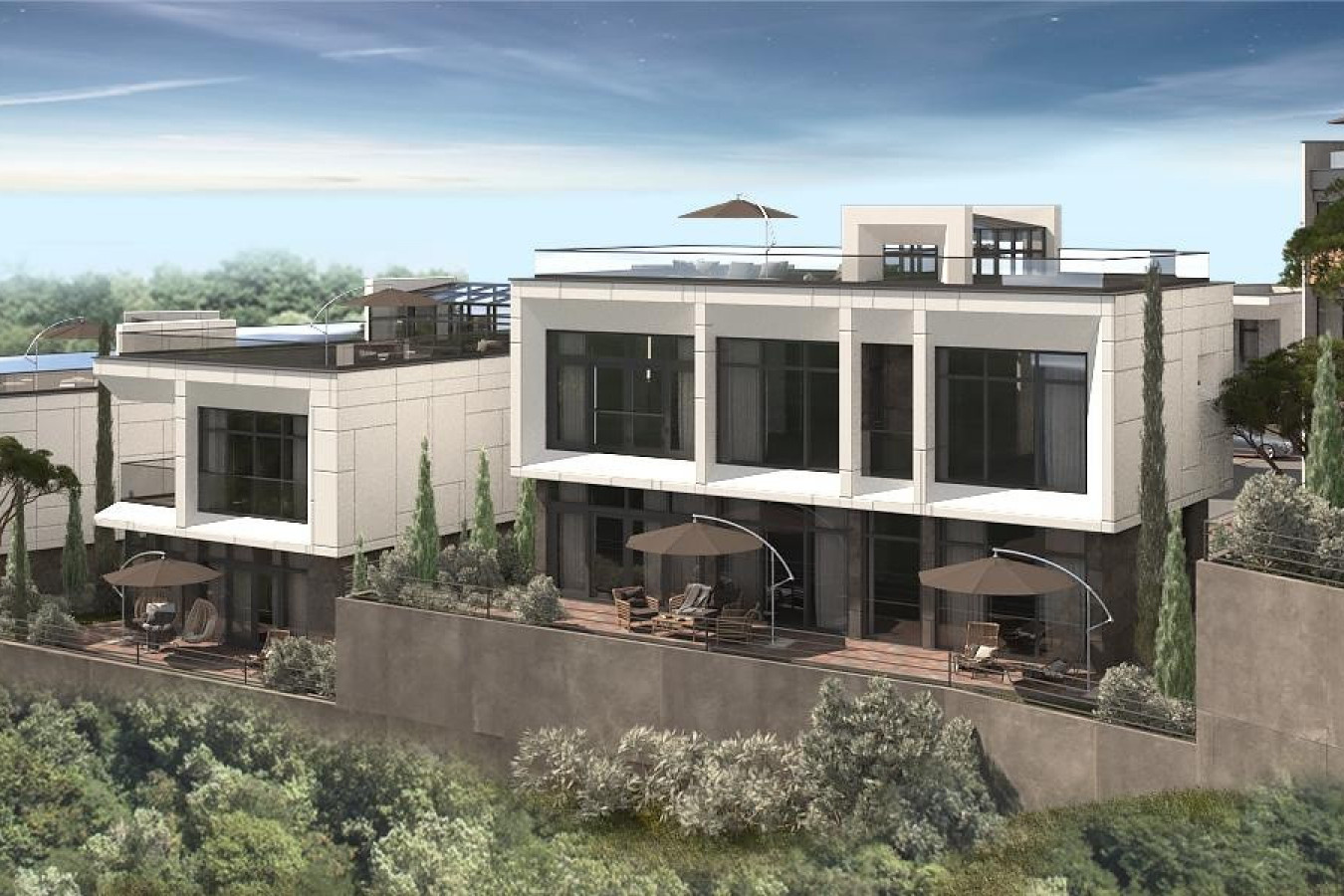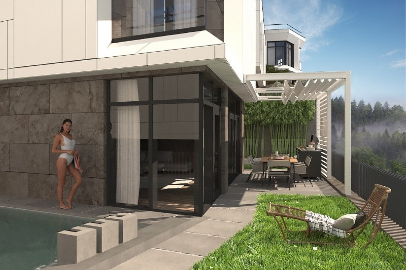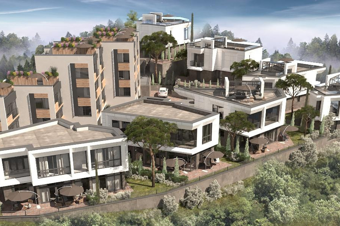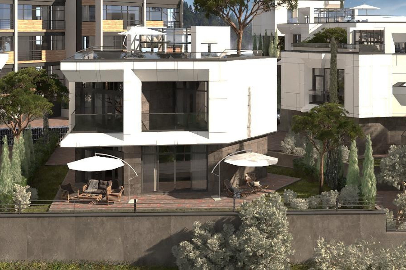 Современная архитектурная концепция с использованием премиальных материалов. Каждая деталь продумана для создания атмосферы курортного уюта и городского комфорта.