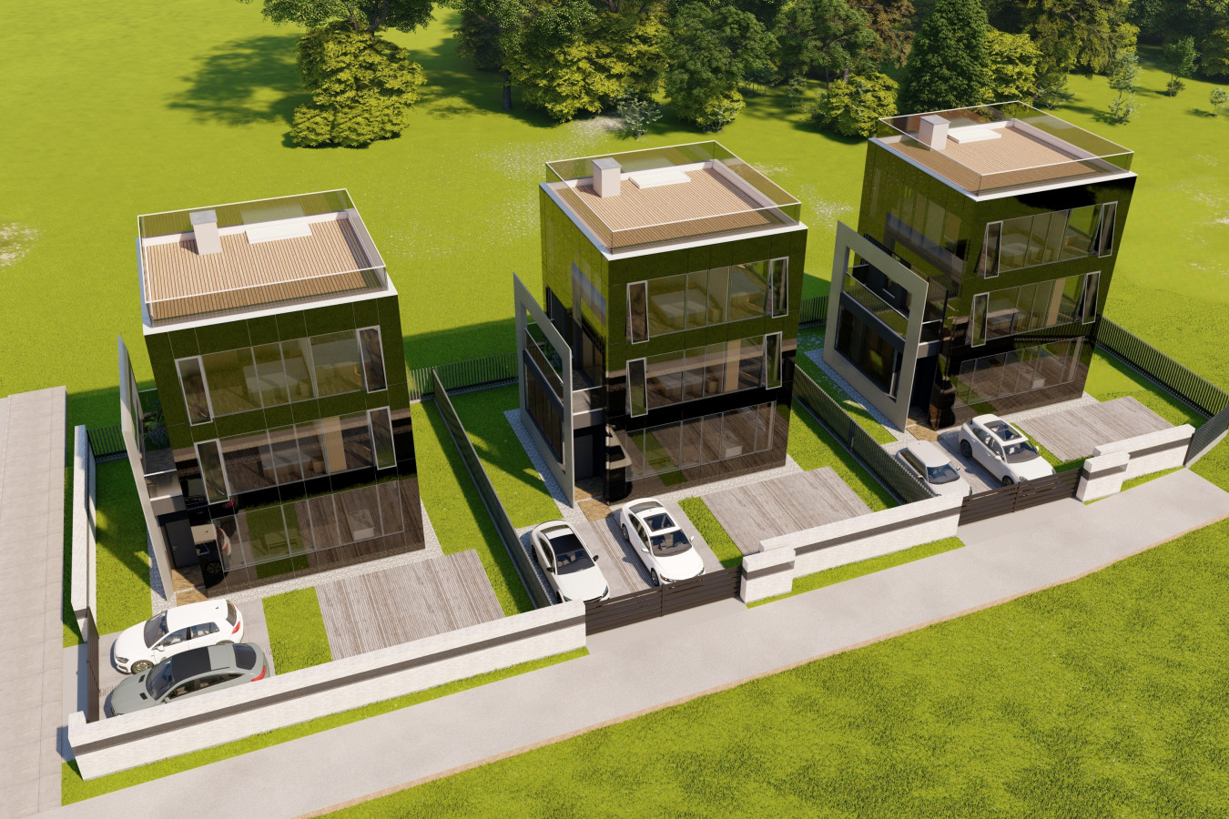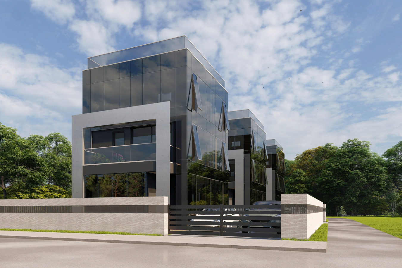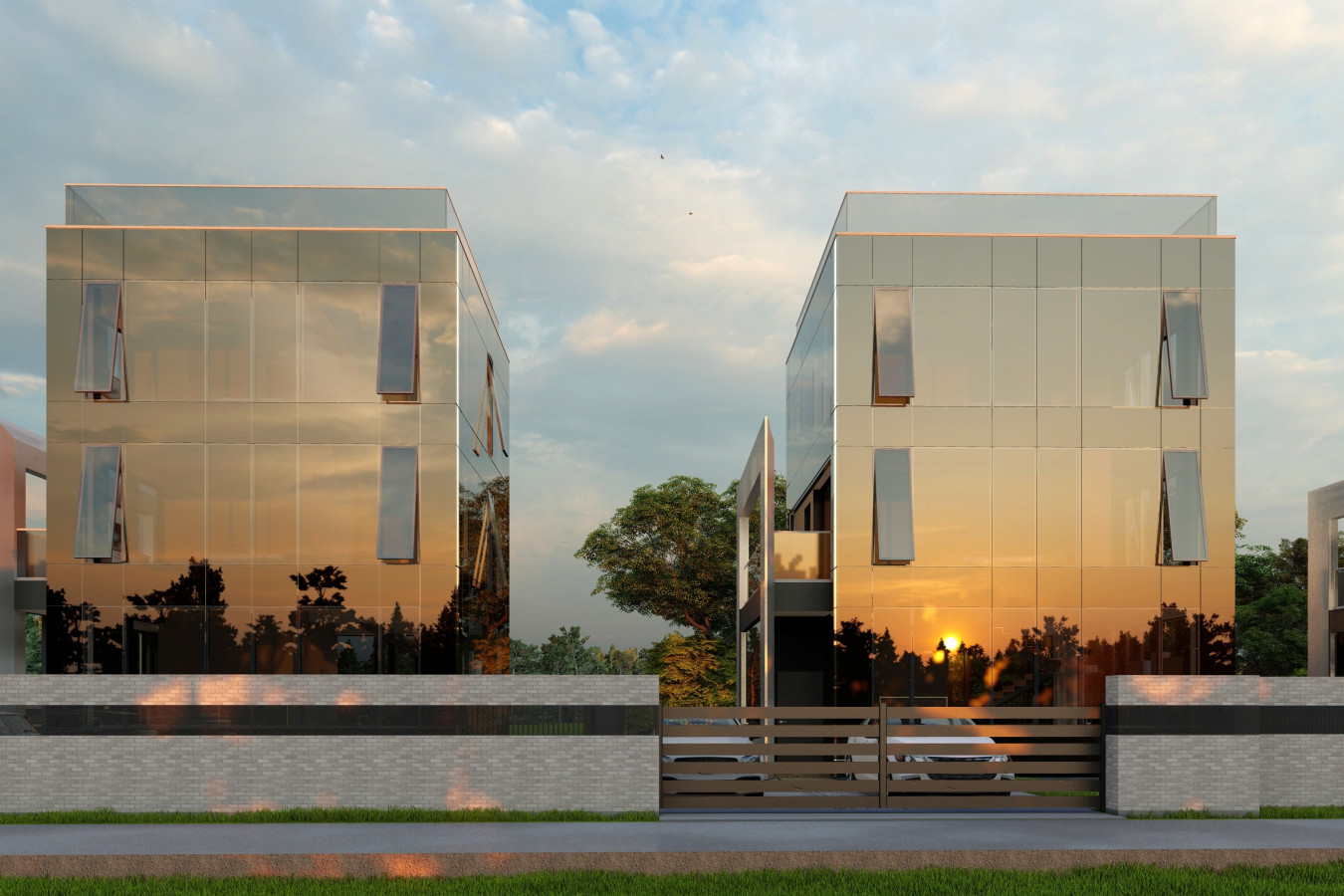 Коттеджный поселок расположен в центре курортной зоны. Поселок состоит из 3 уникальных домов в стиле hi-tech из темного стекла. До моря 350 метров.